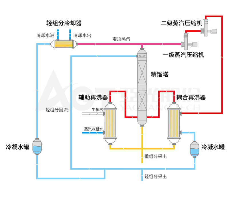将出口处低温位的气体通过压缩机压缩,不需冷凝,提高气体的温度和压力,增加气体的焓值,然后作为再沸器的热源给物料加热,充分利用气体的潜热,减少生蒸汽的用量和循环水,降低运行成本。