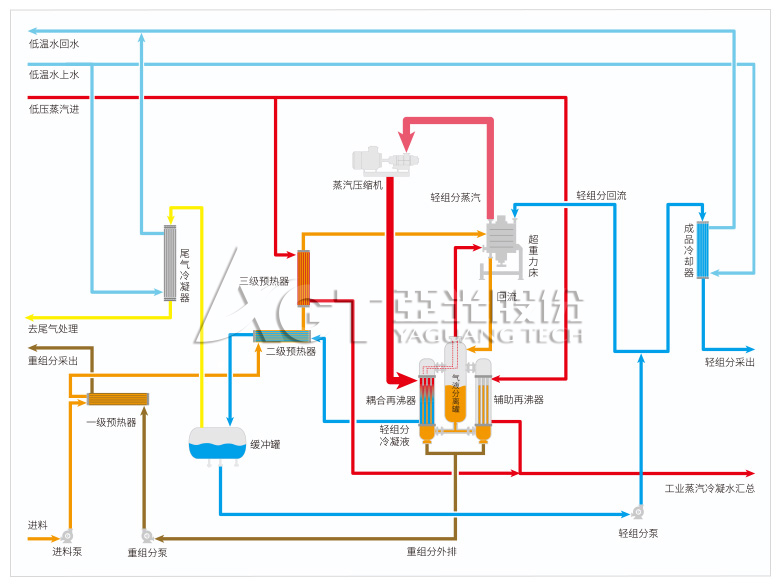 将出口处低温位的气体通过压缩机压缩,不需冷凝,提高气体的温度和压力,增加气体的焓值,然后作为再沸器的热源给物料加热,充分利用气体的潜热,减少生蒸汽的用量和循环水,降低运行成本。